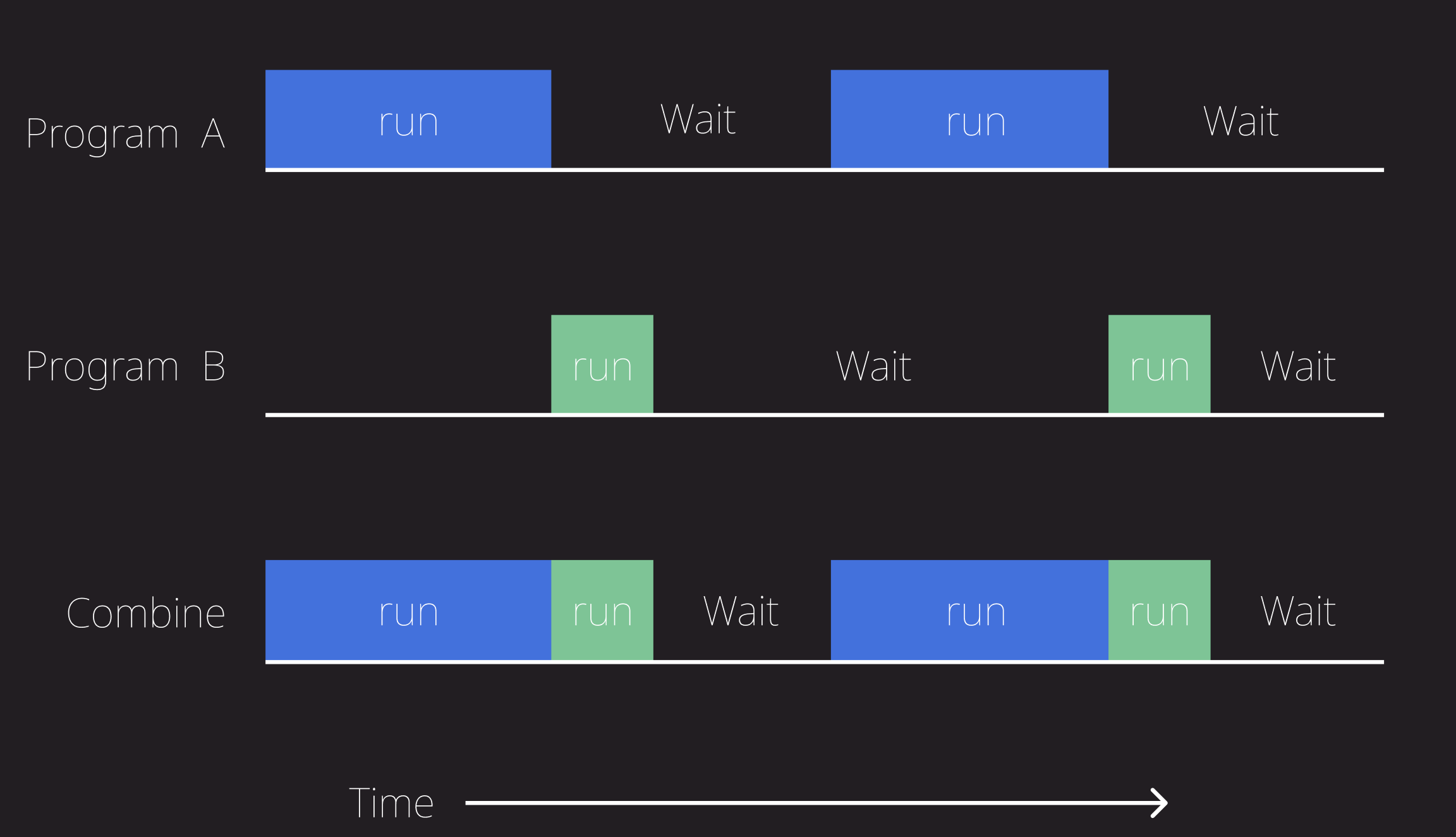 멀티 프로그래밍에서는 위와 같이 프로그램 A 실행 중에 I/O 작업이 발생하면 B를 실행하여 CPU를 효율적으로 사용한다.