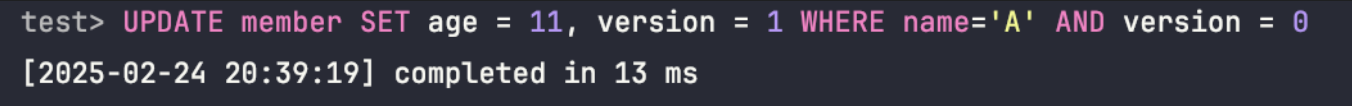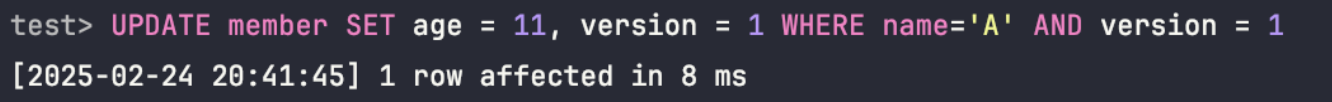 UPDATE member SET age = 11, version = 1 WHERE name='A' AND version = 1;
