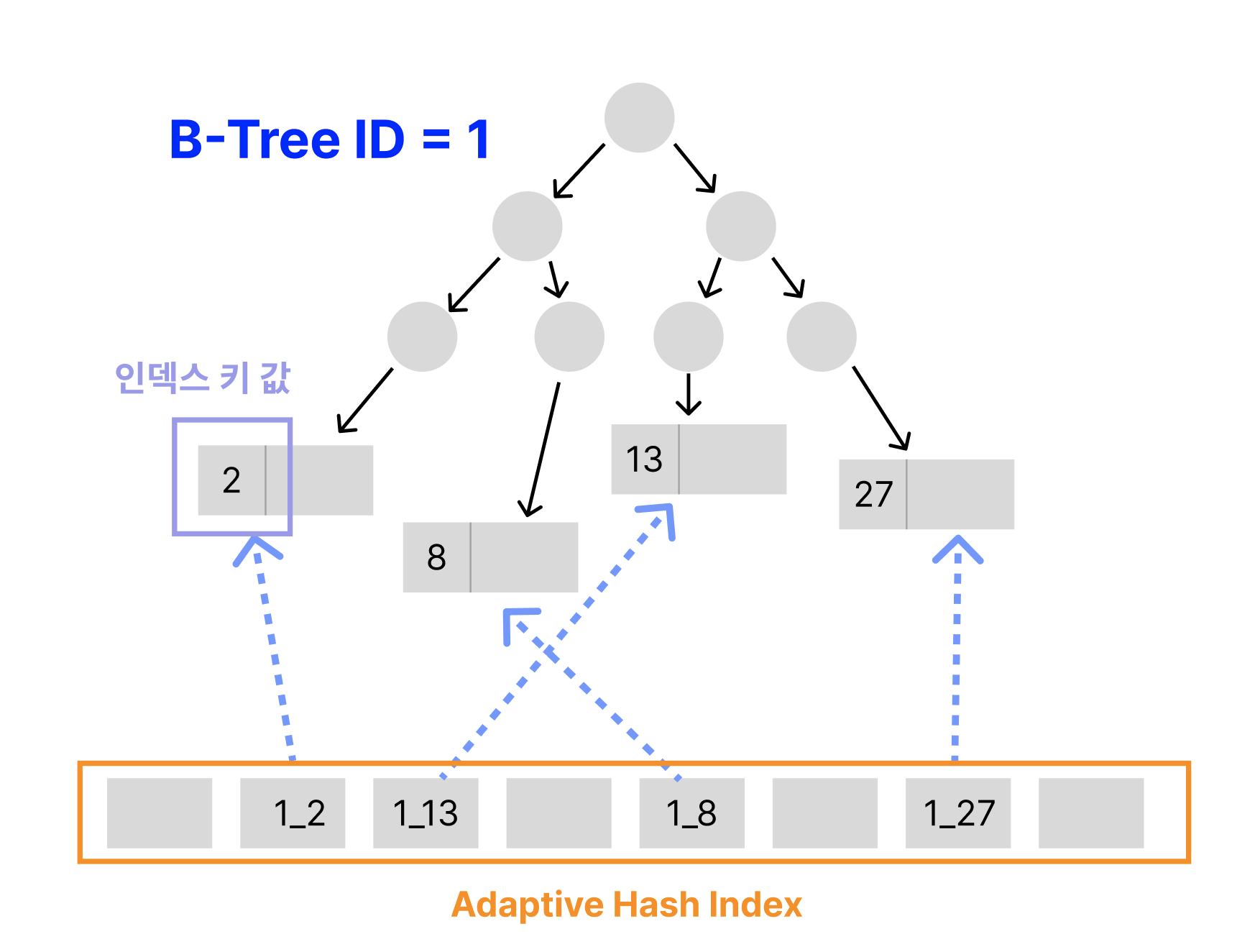 어댑티브 해시 인덱스의 키 값에 B-Tree 인덱스의 Id가 포함되는 이유는,