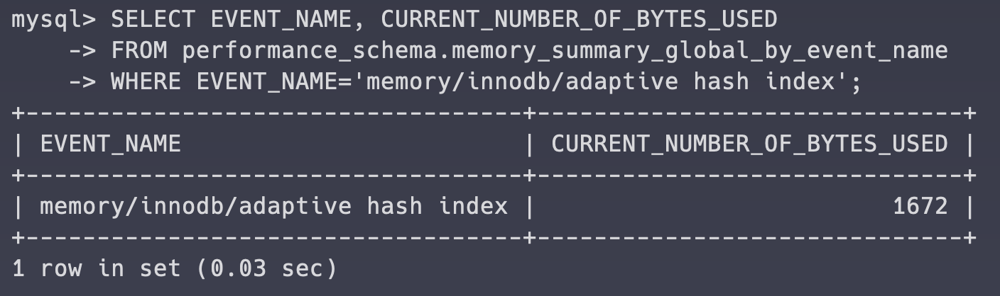 WHERE EVENT_NAME='memory/innodb/adaptive hash index';