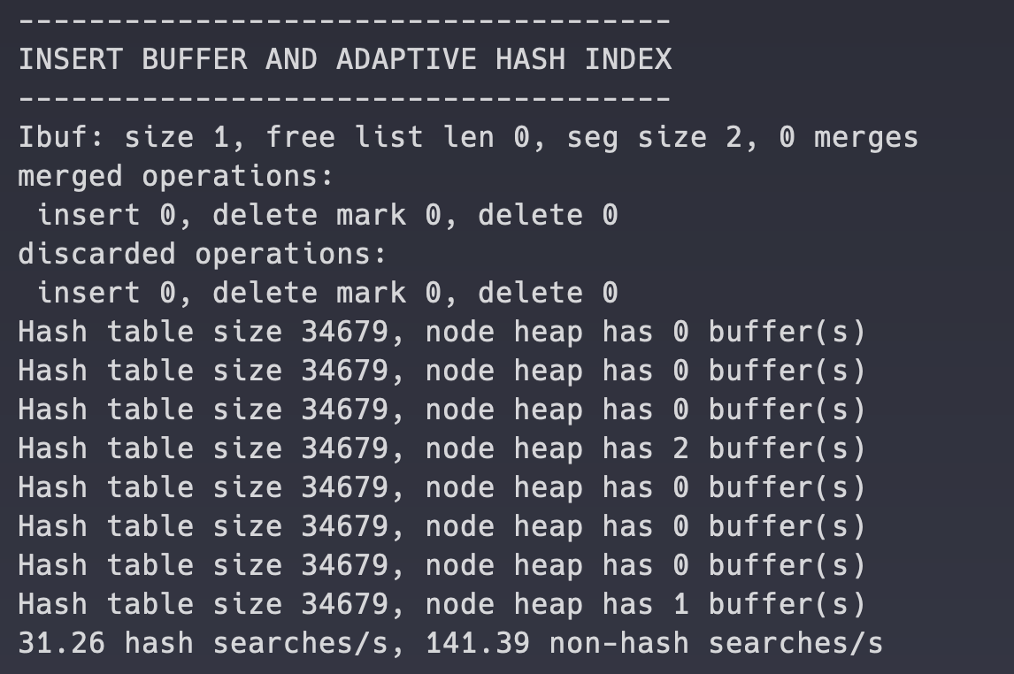 어댑티브 해시 인덱스가 사용중인 메모리 공간의 크기는 다음과 같이 확인할 수 있다.