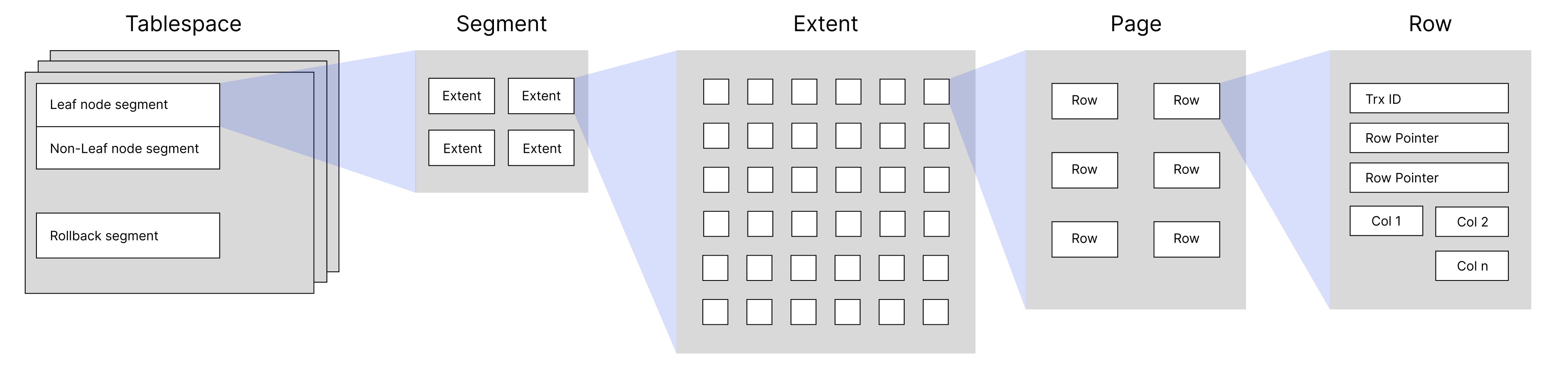 Tablespace -> Segment -> Extent -> Page -> Row 의 형태로 구성된다.